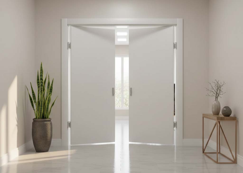 Pintura UV Laca: Acabamento premium em HDF com preenchimento colméia, pintura com secagem UV, disponível na cor Branca.